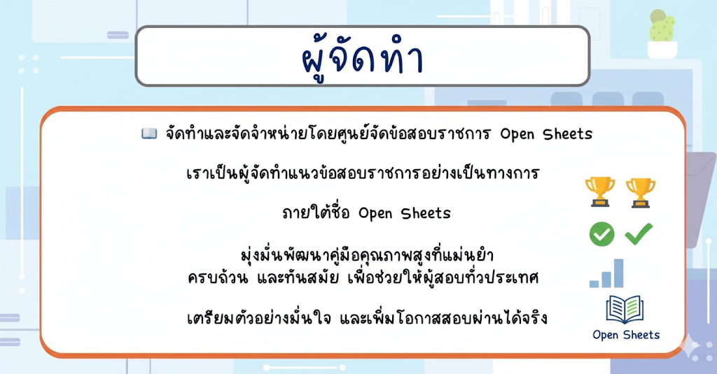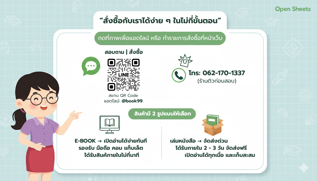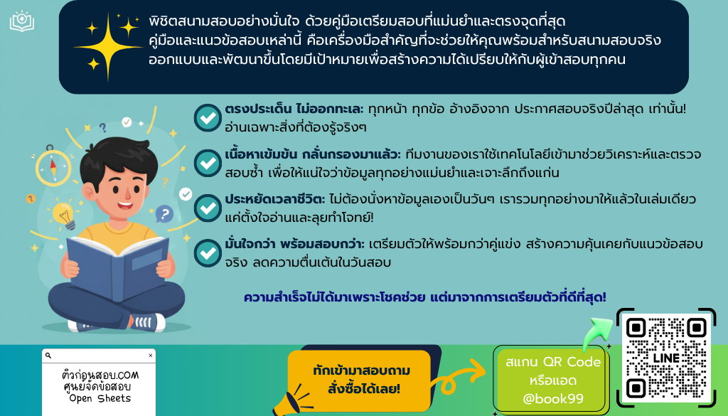ร้านหนังสือ ติวก่อนสอบ .com จัดจำหน่ายในนามศูนย์จัดข้อสอบราชการ Open Sheets เราเป็นผู้จัดจำหน่ายและศูนย์กลางแนวข้อสอบราชการอย่างเป็นทางการ ภายใต้ชื่อ ศูนย์จัดข้อสอบราชการ Open Sheets โดยมีจุดยืนในการมอบ คู่มือคุณภาพสูง ที่ทั้ง แม่นยำ, ครบถ้วน, และทันสมัย เพื่อช่วยให้ผู้สอบทั่วประเทศ เตรียมตัวสอบอย่างมั่นใจ และเพิ่มโอกาสสอบผ่าน **ไม่มีส่วนเกี่ยวข้องกับหน่วยงานในการออกข้อสอบ** ทำไมต้องเลือก “Open Sheets” ? ✅ อ้างอิงประกาศสอบจริงทุกครั้ง ✅ ตรวจสอบความถูกต้องด้วยเทคโนโลยีสมัยใหม่ ✅ อัปเดตข้อมูลต่อรอบปี เพื่อความทันสมัย ตามข่าวทุกช่วงเวลา ✅ พร้อมเฉลย + คำอธิบายละเอียด เนื้อหา และสรุป ✅ ลูกค้าสอบผ่านจริง รีวิวเพียบ 📦 บริการจัดจำหน่าย แนวข้อสอบราชการ ครบทุกหน่วยงาน แนวข้อสอบพนักงานราชการ / รัฐวิสาหกิจ คู่มือเตรียมสอบบริษัทเอกชน รุปเนื้อหา + เทคนิคการสอบ